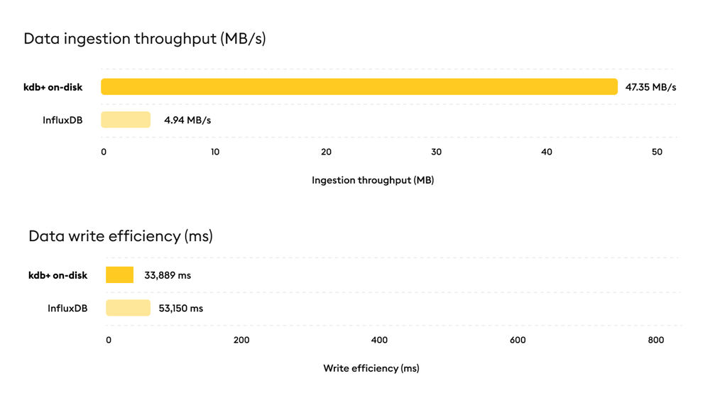 Result: kdb+ delivers materially higher ingestion throughput and faster write completion than InfluxDB under equivalent on disk conditions.