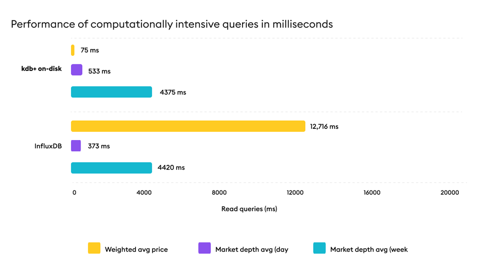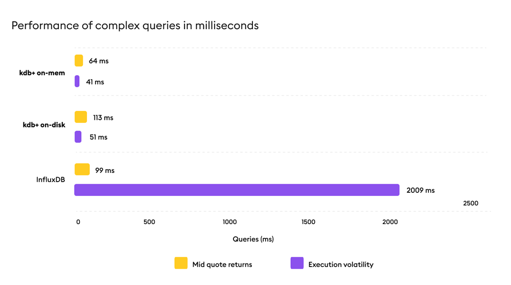 kdb executes advanced calculations including spreads, VWAP, volatility, and signal generation directly within the engine, maintaining low latency as query complexity increases while InfluxDB performance characteristics vary as workloads move beyond aggregation and monitoring patterns.