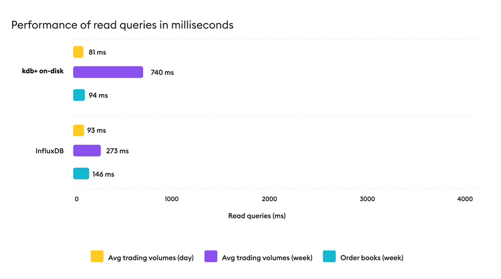 Result: kdb+ demonstrates consistently lower query latency than InfluxDB across read heavy analytical workloads.