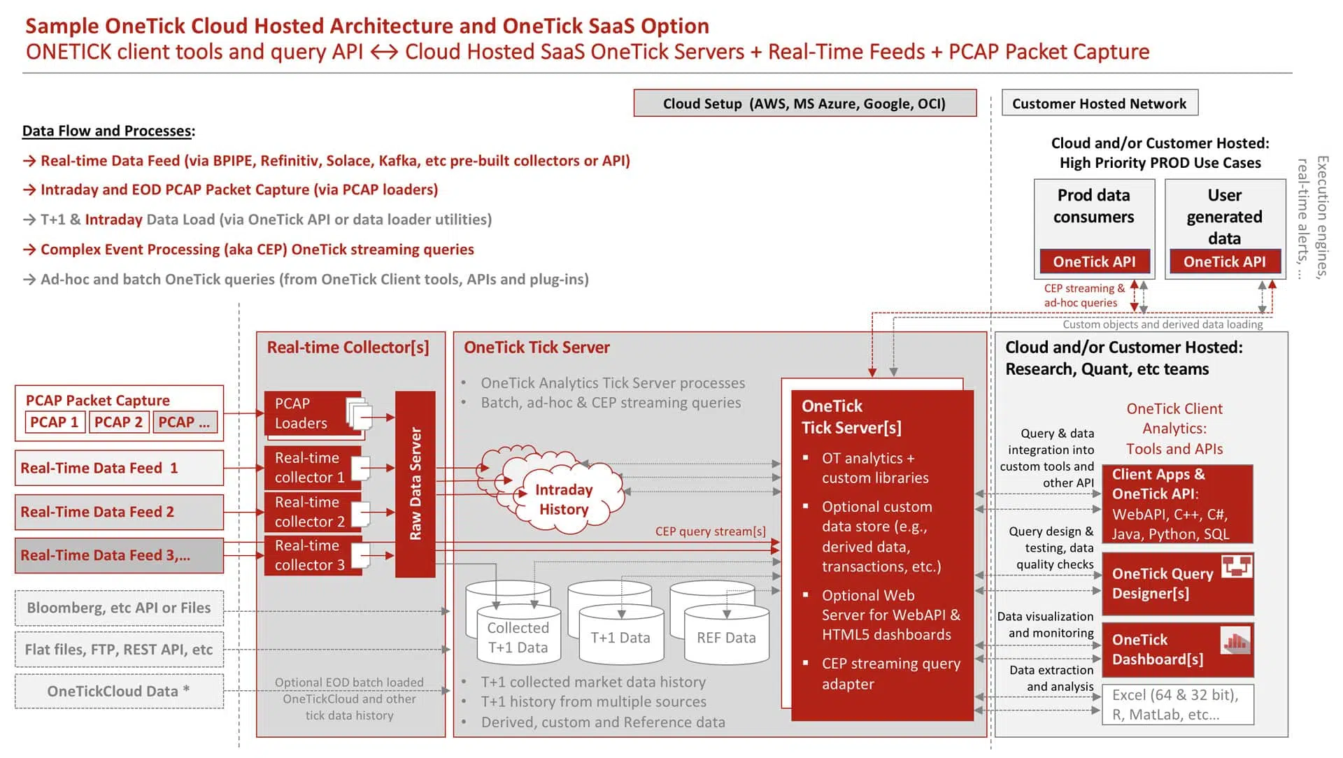 Deploy OneTick efficiently and safely. The OneTick platform can be fully deployed on-premise, fully hosted by OneMarketData on our private cloud (or public cloud) or a hybrid where a portion of the infrastructure is hosted or managed by OneMarketData with a portion is deployed on premise. Elastic “burst” license fee models available for massive queries against hundreds or thousands of cores.