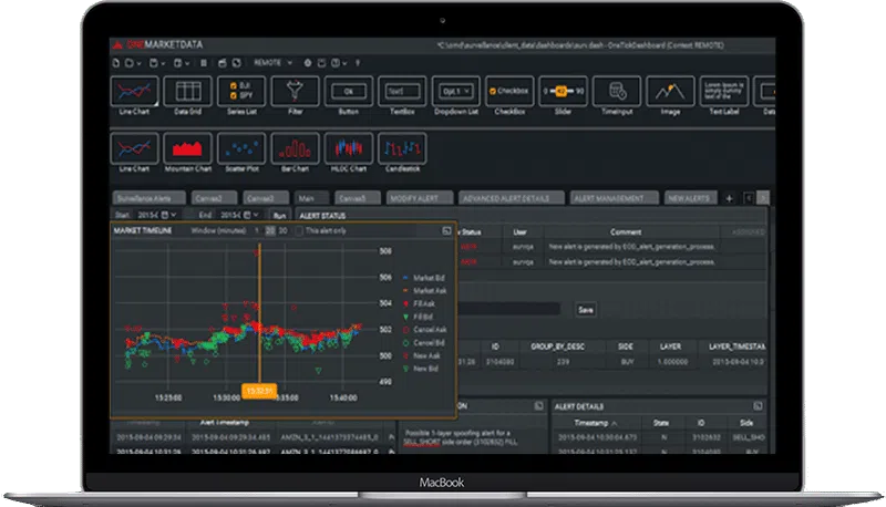 The OneTick Visual Dashboard Designer lets you visualize query results in both historical and real-time complex event processing (CEP) modes, and use those results as interactive control interfaces. You can run dashboards against historical and real-time CEP queries, deploying them as Windows applications or as HTML5 web-based dashboards.