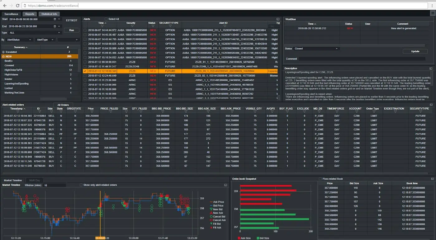 Offers web-based dashboards for efficient review, rapid triage, assigning, reviewing, annotating, and archiving alerts. Features include flexible filtering and grouping, contextual visualizations showing order states and market data, and multi-day/multi-quote views.